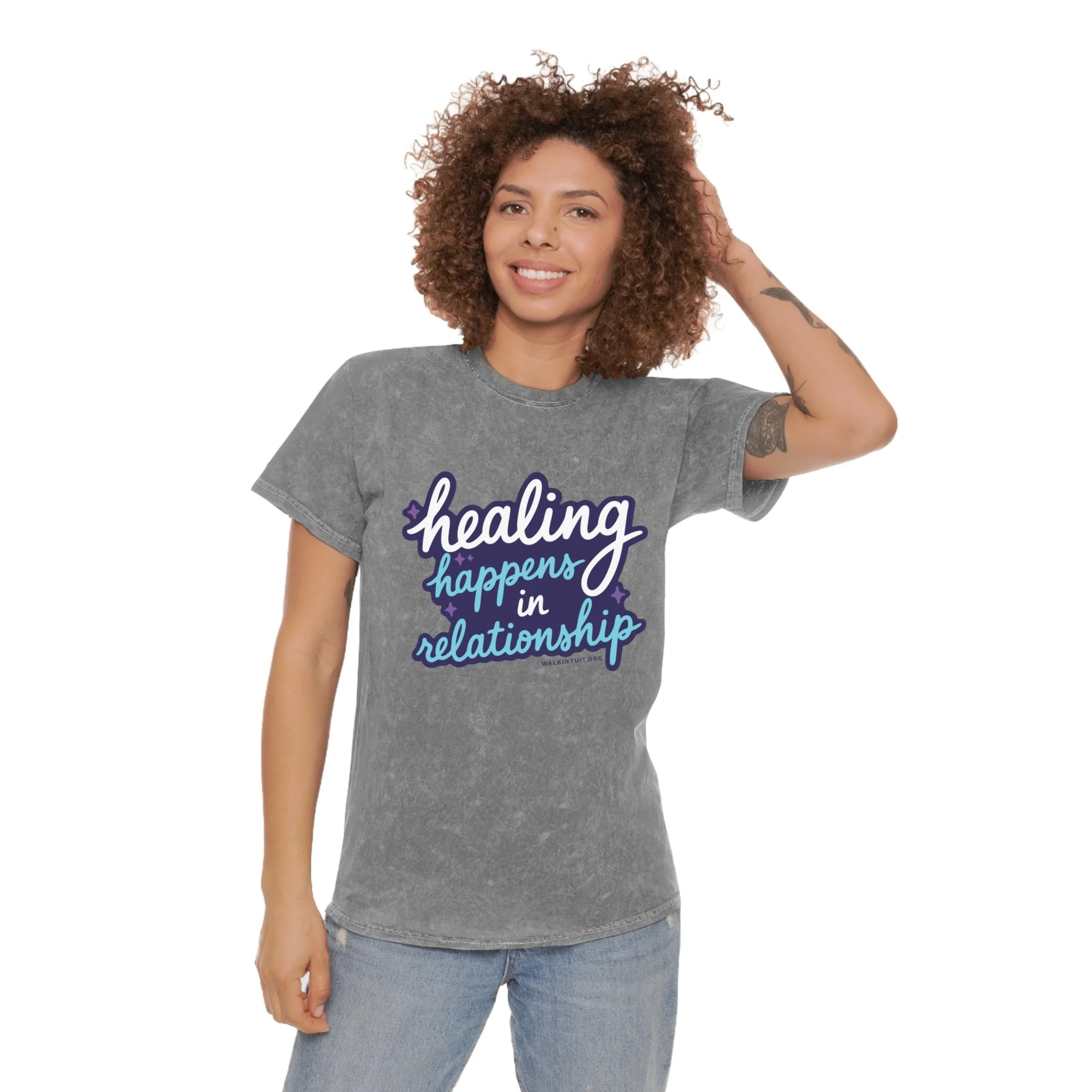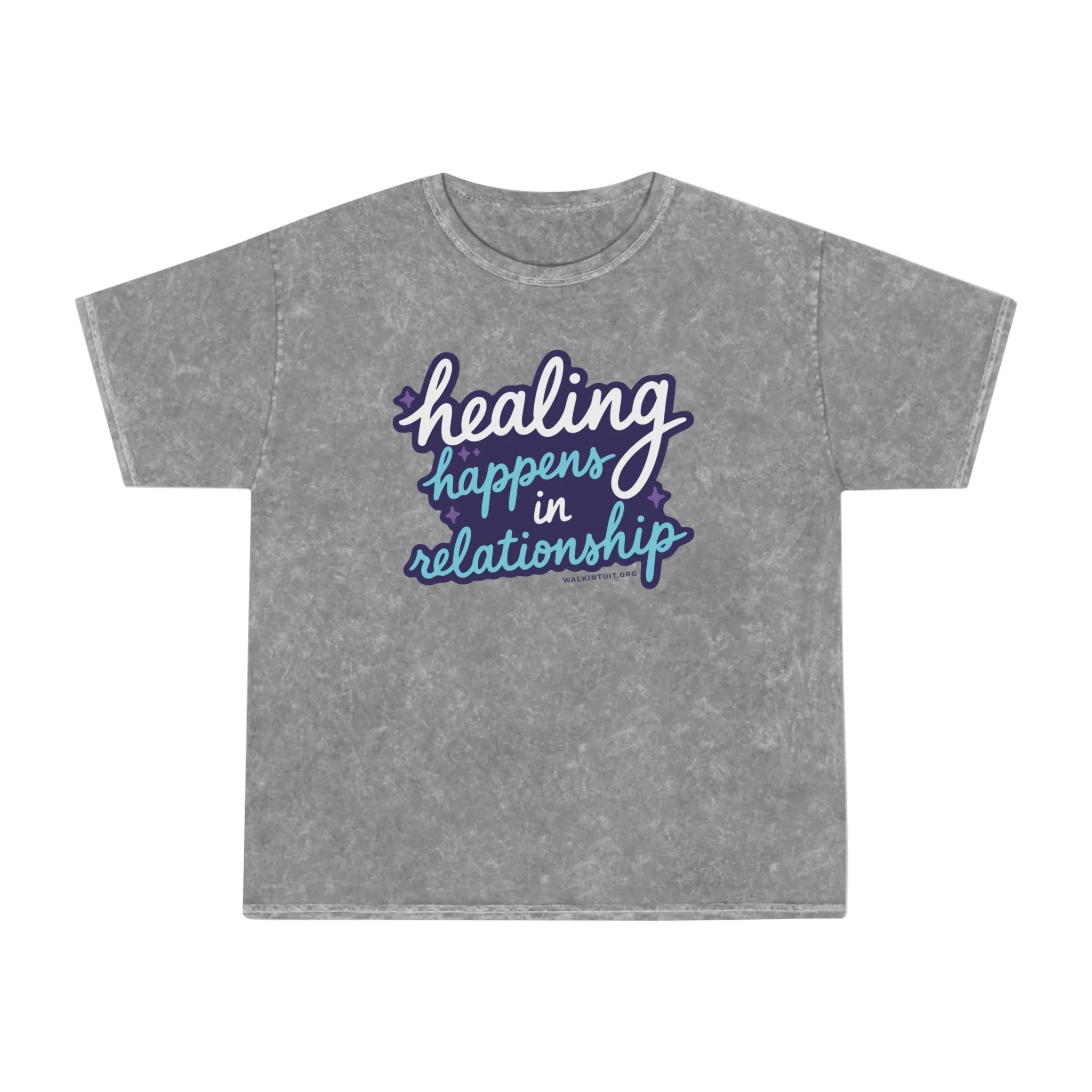 Soft, lived-in, and quietly bold — this mineral-wash tee carries a gentle message: “Healing Happens In Relationship.” The hand-dyed fabric and vintage-washed finish give each shirt its own faded character, like a comfortable companion you reach for on reflective mornings. The relaxed, regular fit and lightweight 100% cotton feel breathable and easy to layer. Subtle shoulder tape and a seam-free ribbed collar keep the silhouette neat while double-needle hems add durability for everyday wear. Wear it to slow coffee shop mornings, mental-health meetups, or evenings on the porch where honest conversation matters. The muted gray wash and pastel design blend into calm wardrobes while still speaking up when it counts.